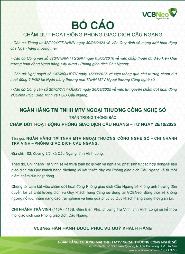 Thông báo chấm dứt hoạt động Phòng giao dịch Cầu Ngang
